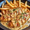 Điểm nổi bật của cơm gà xiên nướng nằm ở phần thịt gà được nướng chín vừa tới, giữ được độ mềm mọng và vị ngọt tự nhiên. Lớp ngoài có độ cháy cạnh nhẹ tạo nên mùi thơm đặc trưng, kích thích vị giác ngay từ lần đầu thưởng thức. Khi ăn, bạn có thể cảm nhận rõ sự hòa quyện giữa vị đậm đà của thịt gà, vị béo nhẹ của khoai tây chiên, cùng sự tươi mát từ rau xanh. Các loại sốt ăn kèm như tương cà hoặc sốt kem giúp tăng thêm độ hấp dẫn, tạo nên tổng thể hương vị hài hòa, không gây ngán dù ăn thường xuyên.