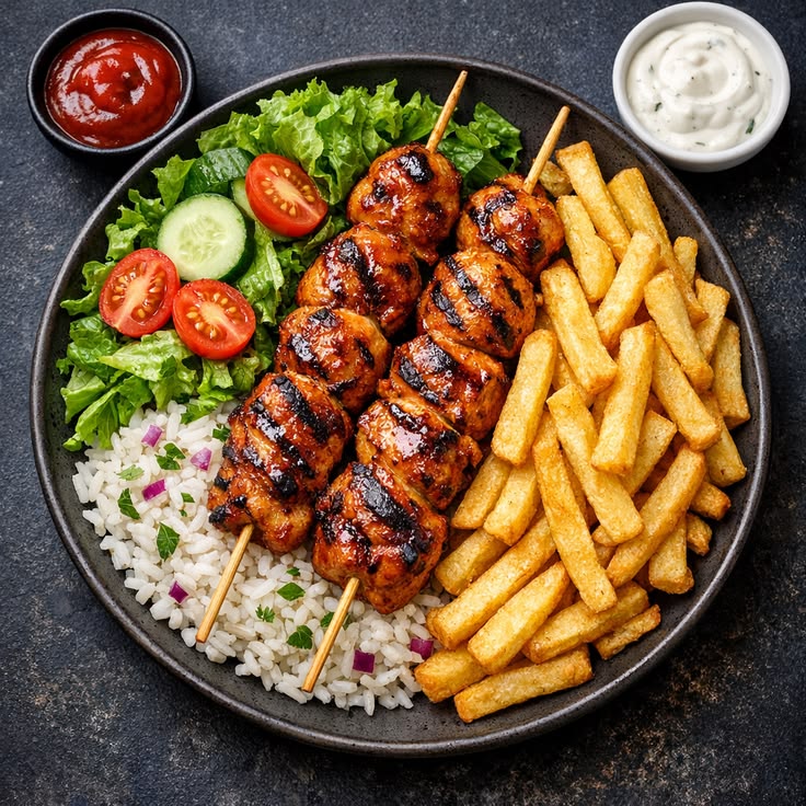 Cơm gà xiên nướng được chế biến từ những nguyên liệu tươi ngon, đảm bảo vệ sinh an toàn thực phẩm. Thành phần chính bao gồm thịt gà tươi giàu protein, được ướp cùng các loại gia vị như tỏi, tiêu, mật ong hoặc sốt đặc trưng để tăng hương vị. Phần cơm trắng cung cấp tinh bột cần thiết, giúp bổ sung năng lượng cho cơ thể. Bên cạnh đó, món ăn còn đi kèm với khoai tây chiên giòn rụm, rau xanh như xà lách, cà chua, dưa leo giúp cân bằng dinh dưỡng và bổ sung chất xơ, vitamin. Sự kết hợp này không chỉ giúp món ăn ngon hơn mà còn hỗ trợ hệ tiêu hóa và mang lại cảm giác no lâu.