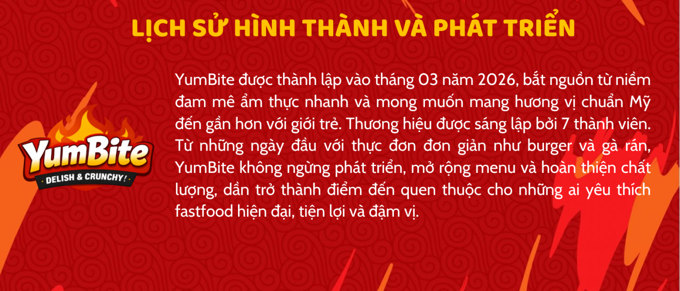YumBite ra đời từ mong muốn mang ẩm thực nhanh chuẩn Mỹ đến gần hơn với giới trẻ. Từ những ngày đầu với thực đơn đơn giản, YumBite không ngừng hoàn thiện hương vị và chất lượng, trở thành điểm đến quen thuộc cho những tín đồ yêu thích burger, gà rán và món ngon hiện đại.